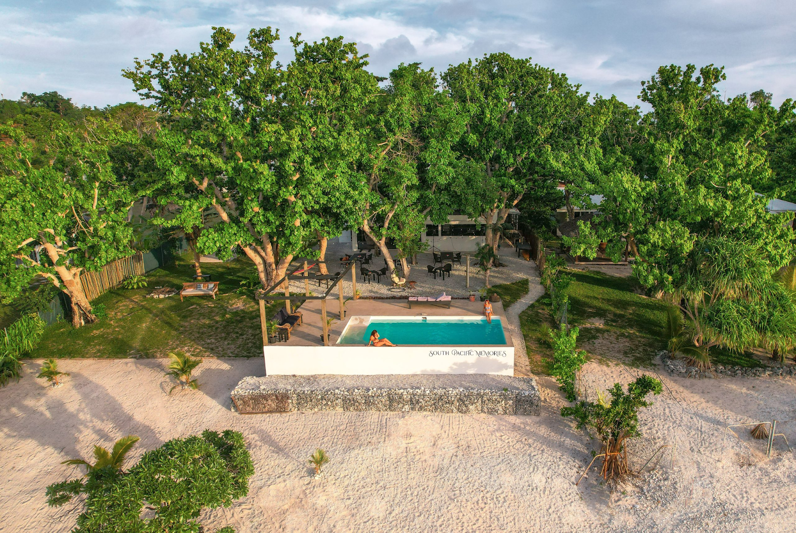 The beachfront dining area and the pool at the resort. Credit: South Pacific Memories